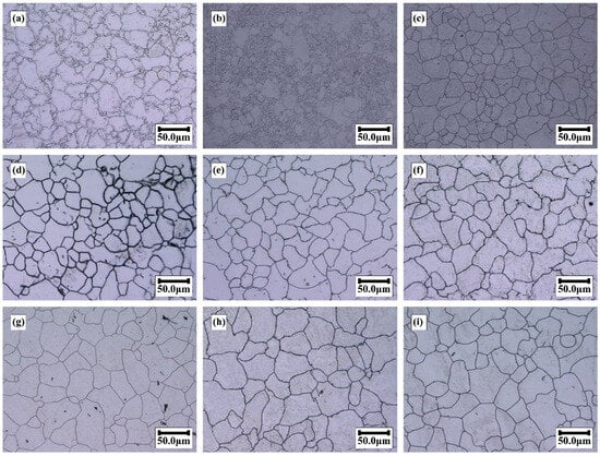 Austenite grain morphology of experimental steel after holding for 20 min at different holding temperatures: (a) 850 °C, (b) 900 °C, (c) 950 °C, (d) 1000 °C, (e) 1050 °C, (f) 1100 °C, (g) 1150 °C, (h) 1200 °C, (i) 1250 °C.