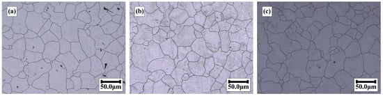 Figure 3 shows the austenite grain morphology of the experimental steel at a heating temperature of 1150 °C for 20 min, 40 min, and 60 min, respectively. When the heating temperature is the same, it can be found that the grain size of the experimental steel increases significantly with the increase in the holding time. When the holding time is 20 min, the average grain size is approximately 30 μm. The average grain size at 40 min was approximately 32 μm. The grain size was approximately 41 μm at 60 min. The growth rate of grain size is relatively slow within 20 to 40 min, which is due to the pinning effect of the second-phase particles. Within 40 to 60 min, some second-phase particles dissolve, and the grains start to coarsen slightly, with the grain size gradually increasing.