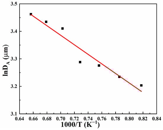 The average size of austenite grains of the experimental steel at the same holding time and different heating temperatures is substituted into Equation (5). According to linear regression analysis, the equation of lnD-1000/T is made, where the slope is −Q/1000 R and the intercept is lnA. Q = 14.421 kJ·mol−1 and A = 99.47 are obtained. The fitting equation is lnDA = 1734.5/T + 4.5999, and the grain growth equation is DA = 99.47 exp(−14,421/RT) with a regression accuracy of 0.9255.