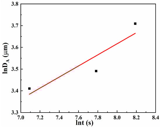 The average size of austenite grains of the experimental steel at 1150 °C with different holding times is substituted into Equation (6). According to linear analysis, the equation of lnDA-lnt is made, where the slope is n and the intercept is lnK. n = 0.2552 and K = 4.83 are obtained, the fitting linear equation is lnDA = 0.2552 lnt + 1.5749, and the fitting Beck’s equation is DA = 4.83 t0.2552 with a regression accuracy of 0.9754.