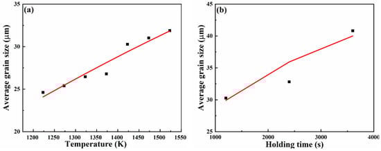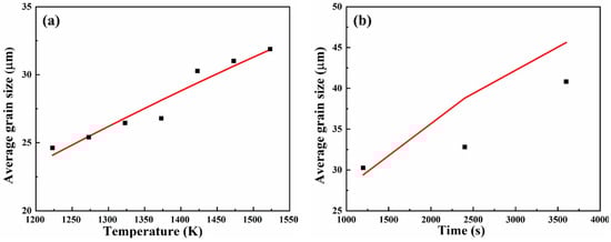 Under high-temperature and prolonged holding conditions, the sensitivity to the initial grain size (D0) is considerably low. In this study, the value of D0 is significantly smaller than the average grain size (D) achieved after the designated holding time. Therefore, the influence of D0 was justifiably neglected in the current model. Thus, we obtain Equation (9):