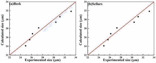 Comparison of experimental values of high-temperature laser confocal microscopy with predicted values of the model: (a) Beck’s model; (b) Sellars’ model.