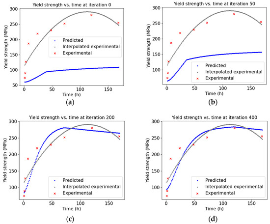 in the normalised YS predictions and training data. The time step of 0 indicates the YS curve is derived from the initialisation values without any prior optimisation attempts. The interpolated data is generated with the polyfit method of NumPy (version 1.26.0) to fit the scarce experimental data to a polynomial of degree two. The time axis of the interpolated data matches the time axis of the KWN model’s prediction. In our work, a 1-h time resolution has been chosen as a compromise between the computational cost and the required accuracy to cover the domain of the training data. It is worth noting that the interpolation facilitates the model to reach a compromise between the physics-based constraints and the experimental data. The moving breakpoint observed in the predicted YS curves reflects the growth of the precipitate size class over time. As the particles grow and exceed the critical radius, the model transitions from the strong (shearable) to the weak (non-shearable) strengthening mechanisms. The full gradient-based training process is shown in