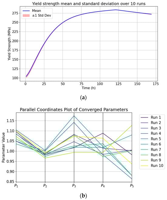 Figure 5a exhibit close agreement across all trials, ranging from 104.0 ± 3.0 MPa in the under-aged to 279.2 ± 0.3 MPa in the peak-aged and to 271.9 ± 0.8 MPa in the over-aged conditions. The relatively larger uncertainty observed in the under-aged regime can be attributed to the fact that the KWN model provides its most accurate description near the peak-aged conditions, where β″ precipitates dominate the microstructure. Although the predicted YS curves show high consistency across the Monte Carlo trials, the corresponding fitted coefficients exhibit substantial variability (