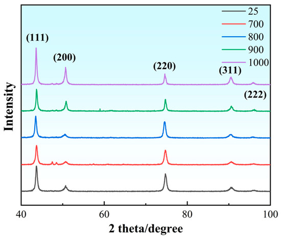 Figure 1 presents the X-ray diffraction (XRD) patterns of the FeCoNiCrTi0.2 high-entropy alloy in the as-rolled condition and after annealing at various temperatures. The results indicate that all specimens retain a single-phase face-centered cubic (FCC) structure, confirming the alloy’s excellent phase stability across the temperature range from 25 °C to 1000 °C. The primary diffraction peaks clearly correspond to the (111), (200), (220), (311), and (222) crystallographic planes of the FCC phase. Notably, a weak diffraction signal is observed near the (200) peak in the specimen annealed at 700 °C, which may be attributed to the minor precipitation of the σ phase [31]. The diffraction peak positions remain largely unchanged across the entire temperature range, suggesting that the small addition of Ti does not lead to significant phase decomposition or appreciable lattice parameter variations, thereby further supporting the thermal stability of the alloy.