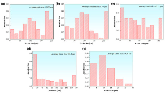 Grain size distribution histograms of samples after annealing at different temperatures. (a) Cold rolled sheet; (b) 700 °C; (c) 800 °C; (d) 900 °C; (e) 1000 °C.