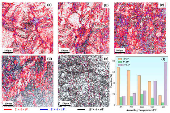 Grain boundary diagrams of specimens after annealing at different temperatures. (a) Cold rolled sheet; (b) 700 °C; (c) 800 °C; (d) 900 °C; (e) 1000 °C; (f) The fraction of boundaries.