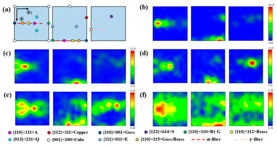 ODF sections (with φ2 = 0°, 45°, 65°). (a) The main ideal orientations present in rolled fcc material; (b) cold rolled sheet; (c) 700 °C; (d) 800 °C; (e) 900 °C; (f) 1000 °C.