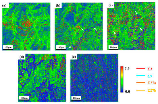 The dynamic evolution of twin boundaries during annealing plays a critical role in regulating recrystallization. Overall, the number of twin boundaries tends to increase with rising annealing temperature. As shown in Figure 6a, deformation twin regions are observed in the as-rolled sample, with Σ3 twin boundaries constituting 54.4% of the total boundaries (Table 1). This observation is commonly reported in metals with low stacking fault energy (SFE) [16]. Owing to their robust interfacial stability, Σ3 twin boundaries function as efficient obstacles to dislocation movement, rendering them key focuses for enhancing the strength–toughness balance in materials [42]. Figure 6b reveals that annealing at 700 °C results in a twin distribution similar to the as-rolled state, albeit with a reduced Σ3 fraction of 31.3%. Wang et al. [43,44] demonstrated that low-angle grain boundaries (LAGBs) undergo a progressive transformation into stable twin boundaries and low-energy grain boundaries at elevated annealing temperatures. For the sample annealed at 800 °C, annealing twins were observed to form within the recrystallized regions, while most deformation twins were retained as a result of incomplete recrystallization. As shown in Table 1, further increases in temperature led to a non-monotonic variation in the Σ3 boundary content—initially decreasing and subsequently increasing with the progression of recrystallization. In contrast, the fractions of Σ9 and Σ27a twins consistently increased [37]. The migration of grain boundaries promotes the nucleation of annealing twins (Σ3), while interactions between pre-existing and newly formed Σ3 boundaries result in the formation of Σ9 and Σ27 boundaries [45].