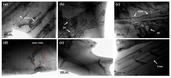 Figure 7 shows the microstructure of the FeCoNiCrTi0.2 samples. As illustrated in Figure 7a,b, the presence of dense dislocation walls (DDWs) and dislocation cells (DCs) has been observed in both the cold-rolled state and the annealed samples at 700 °C [46]. These observations are in alignment with the characteristic sub-structural features typically associated with cold-deformed materials. For the samples that underwent annealing at 900 °C, a substantial decrease in dislocation density was observed. However, the presence of prominent dislocation walls (DDWs) remains evident in the images, and the dislocation entanglement networks and nano-twins persist in a localized manner (Figure 7d). As illustrated in Figure 7f, the grains exhibit annealed twins, which are indicative of the characteristic substructure associated with recrystallization [31,47]. As annealing temperature rises, dislocation density diminishes, whereas dislocation rearrangement leads to the gradual vanishing of dislocation cell boundaries.