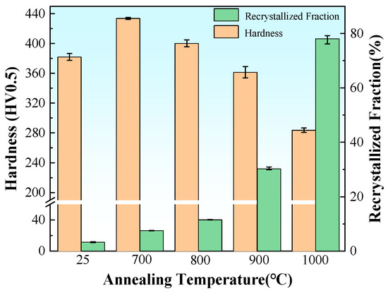 Recrystallization fraction and hardness as a function of annealing temperature.