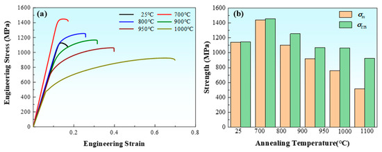 (a) Engineering stress–strain curves of specimens annealed at different temperatures; (b) histograms of σ YS and σ UTS.