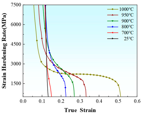 Figure 10 shows the strain-hardening curves of cold-rolled FeCoNiCrTi0.2 after annealing at various temperatures. For samples annealed at temperatures lower than 700 °C, the strain-hardening rate decreases rapidly with increasing strain. This behavior can be attributed to the high initial dislocation density resulting from the cold rolling process, which leads to rapid dislocation entanglement and saturation of their storage capacity. Conversely, for samples that have been subjected to annealing at temperatures above 800 °C, lower initial dislocation densities can facilitate the sustained multiplication of dislocations. The strain-hardening behavior exhibited by these materials can be categorized into three distinct stages: The first stage is characterized by a substantial decrease in the strain-hardening rate as true strain increases. The second stage is characterized by the attainment of a steady-state regime, wherein the processes of dislocation multiplication and annihilation attain dynamic equilibrium. This equilibrium is facilitated by substructures such as deformation twins, which enhance dislocation storage and mitigate the reduction in hardening rate. The third stage features a sharp decrease in hardening rate due to localized necking until reaching the tensile strength limit. For example, for the sample annealed at 1000 °C, the strain-hardening rate diminishes from approximately 7500 MPa at a strain of 0.058 to around 580 MPa at a strain of 0.51. Thus, an increase in annealing temperature correlates with a decrease in the strain-hardening rate for any given level of strain while simultaneously leading to an increased proportion within the second stage of strain hardening. This observation indicates an augmented hardening capacity of the material.