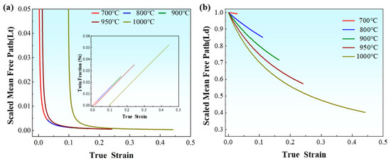 Here, ϕ represents the material constant, which is set to 0.155 [23,64]. The symbol εt denotes the initial twin strain, which is determined by the critical twinning stress. Steinmetz et al. developed a model of critical twinning stress based on the Mahajan-Chin three-layer twinning mechanism [65]. In this study, the critical twinning stress was set to 820 MPa, referencing the FeCoNiCr high-entropy alloy [66,67]. Tensile test results indicated that the true strains of the samples annealed at 950 °C and 1000 °C were 0.01 and 0.096, respectively. For samples that underwent annealing at temperatures below 950 °C, the yield stress exceeds 820 MPa, suggesting that εt can be considered negligible. According to the principles of dislocation dynamics theory, Kubin et al. [68] advanced a model for the evolution of the mean dislocation-free path. This model is predicated on the assumption that deformation twinning does not exert an effect on the deformation process, as delineated in Equation (6).