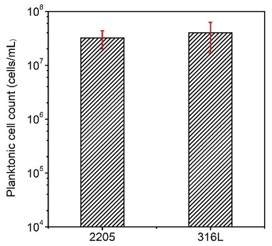 The planktonic cell in the culture medium also showed slight differences between the two types of stainless steel. In Figure 1, the planktonic cell of the 2205 duplex stainless steel group was lower than that in the 316L stainless steel, with counts of 3.2 × 107 ± 1.2 × 106 cells/mL and 4 × 107 ± 2.3 × 106 cells/mL, respectively (error bars stand for the standard deviations from three independent coupons). A lower cell count typically leads to less corrosion damage, while a higher cell count may indicate more severe corrosion issues for the material.