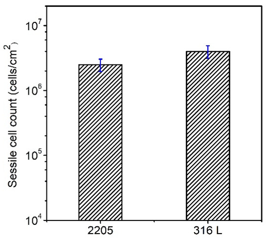 The sessile cell count (Figure 2) on the 2205 duplex stainless steel was relatively lower (2.5 × 106 ± 5.4 × 105 cells/cm2) than the 316L stainless steel, which showed a higher attachment of D. vulgaris cells (4.0 × 106 ± 8.9 × 105 cells/cm2), which corresponds to the weight loss trends. Error bars stand for the standard deviations from three independent samples. Higher sessile cell count requires more free electrons as nutrients for D. vulgaris metabolism, thereby promoting the rapid growth of D. vulgaris on the 316L surface.