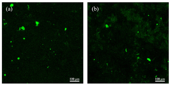 CLSM was applied to evaluate the distribution of live cells on the coupons. From the fluorescence images (Figure 3), it can be observed that the green fluorescent spots on the surface of 2205 stainless steel are sparse, with a discrete distribution and low brightness, indicating limited attachment of D. vulgaris cells on its surface and weak biofilm formation capability. In contrast, the surface of 316L stainless steel exhibits dense fluorescent spots with enhanced brightness, suggesting that the surface of 316L is more prone to D. vulgaris adhesion and proliferation, and the biofilm development is more extensive. Thus, it can be inferred that 2205 stainless steel has an advantage in inhibiting D. vulgaris biofilm formation.