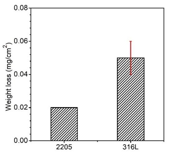 The weight loss results of 2205 duplex stainless steel and 316L stainless steel after being immersed in D. vulgaris standard culture medium for 7 days are shown in Figure 4. It can be observed that the corrosion loss of 2205 duplex stainless steel is relatively low, which is related to its higher content of Cr and Mo. These two compositions typically enhance the traditional corrosion resistance property of iron [28,29], which also enhances the MIC resistance property. The results show that the weight loss of 2205 duplex stainless steel is 0.02 mg/cm2, while that of 316L stainless steel is 0.05 ± 0.01 mg/cm2. This indicates that the MIC induced by D. vulgaris on 316L stainless steel is more severe than that on 2205 duplex stainless steel. The trend of weight loss is consistent with sessile cell counts, which is followed by EET-MIC.