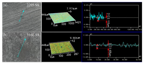 where Δm is the weight loss, ρ is the density (7.98 g/cm3 for 316L austenitic stainless steel and 7.80 g/cm3 for 2205 duplex stainless steel), A is the exposed surface area (1 cm2), and t is the corrosion time. This method quantitatively assesses the corrosion performance of different stainless steels [27].