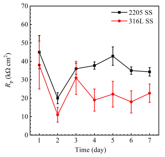 Figure 7. Variation of Rp with days for 2205 duplex stainless steel and 316L stainless steel for 7 days of incubation in 450 mL anaerobic bottles.