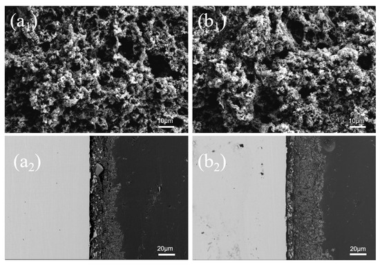 Figure 11. Surface morphology and cross-sectional morphology of 2205 and 316L flat samples after being immersed in the D. vulgaris environment for 7 days: (a1,a2) 2205; (b1,b2) 316L.