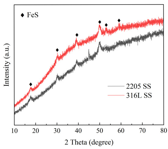 Figure 12. XRD spectra of corrosion products on 2205 and 316L flat samples after being immersed in the D. vulgaris environment for 7 days.