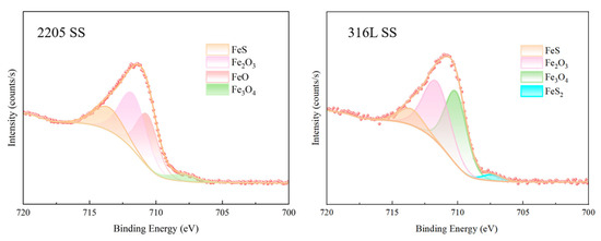 FeS in 2205 accounted for 19.88%, higher than 10.65% in 316L, indicating that both stainless steels were affected by D. vulgaris and underwent sulfidation. Li et al. observed a similar shift (713.6 eV) in iron sulfide produced by MIC [34]. Notably, FeS2 was only detected on the 316L surface, with an atomic percentage of 4.28%. FeS2 is a thermodynamically more stable deep-sulfidation product [35,36], typically formed from FeS under sustained anaerobic conditions, and its presence indicates that the corrosion process has entered a later, irreversible stage.