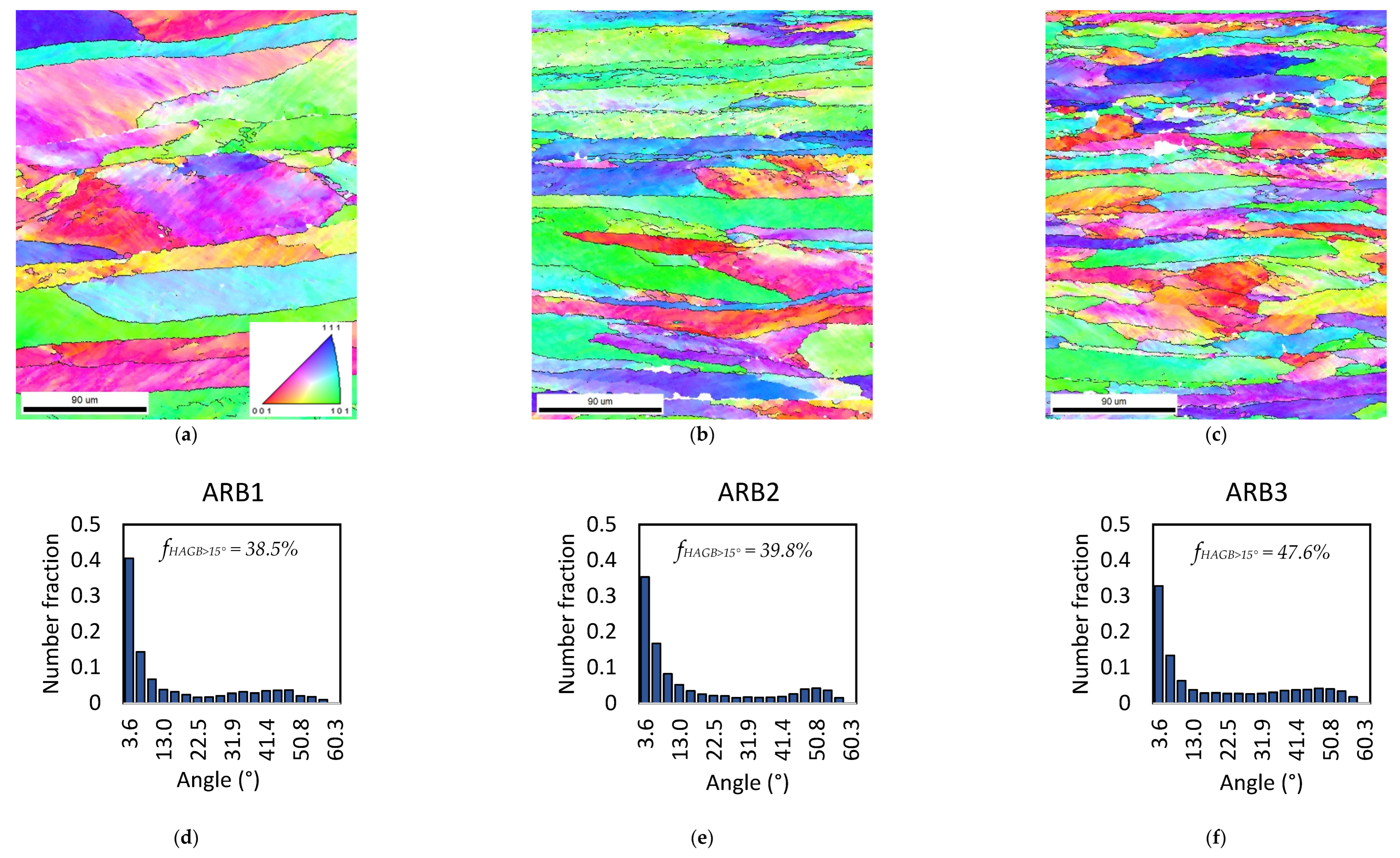 - Microstructural observations revealed progressive grain refinement; EBSD analysis showed an increase in high-angle grain boundaries and reduced grain elongation with each ARB cycle, indicating recrystallization and improved homogeneity;