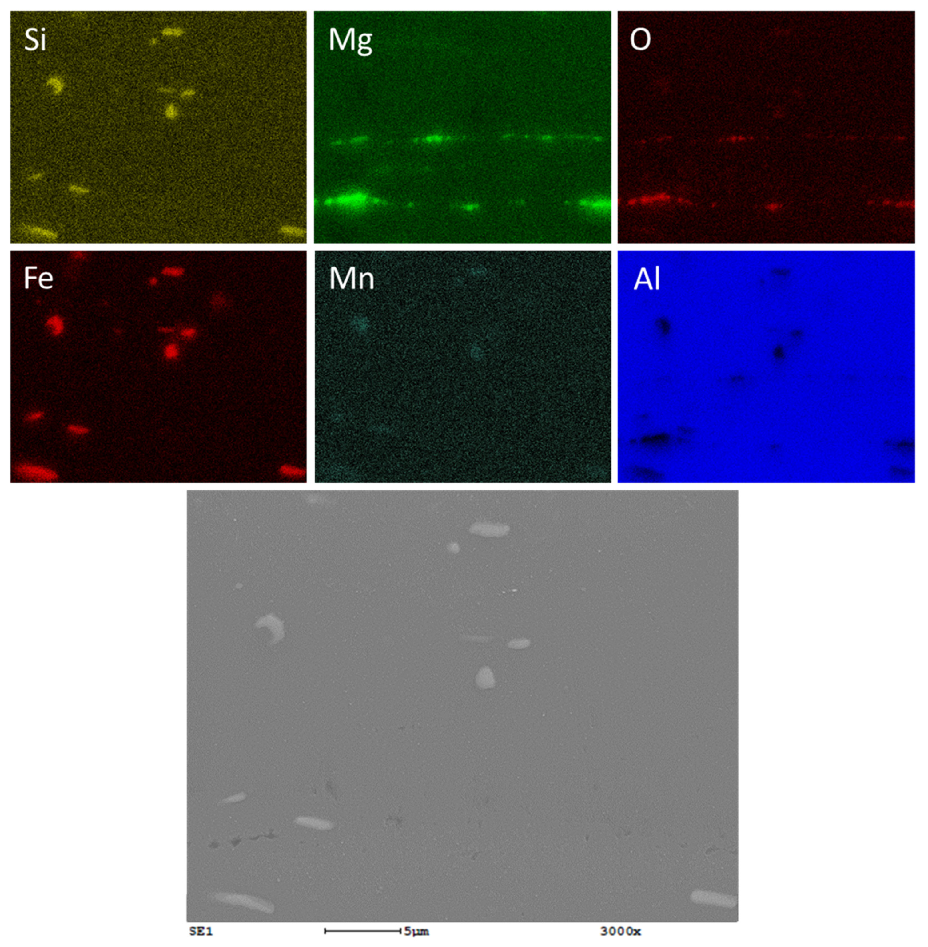 - Kuijpers, N.; Vermolen, F.; Vuik, C.; Koenis, P.; Nilsen, K.; van der Zwaag, S. The dependence of the β-AlFeSi to α-Al(FeMn)Si transformation kinetics in Al–Mg–Si alloys on the alloying elements. Mater. Sci. Eng. A 2005, 394, 9–19. [Google Scholar] [CrossRef]