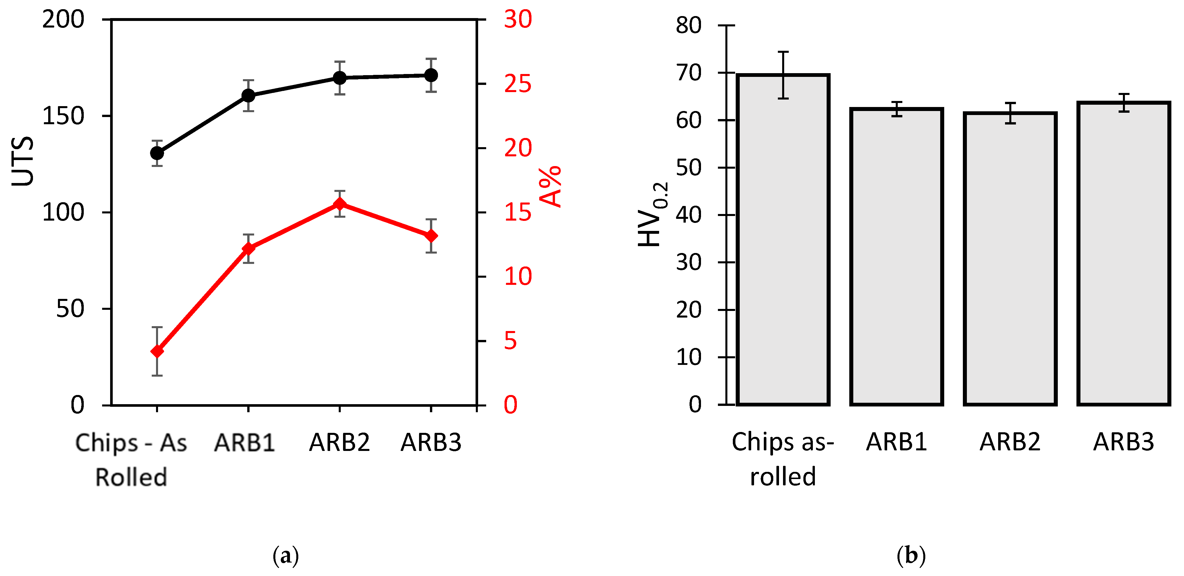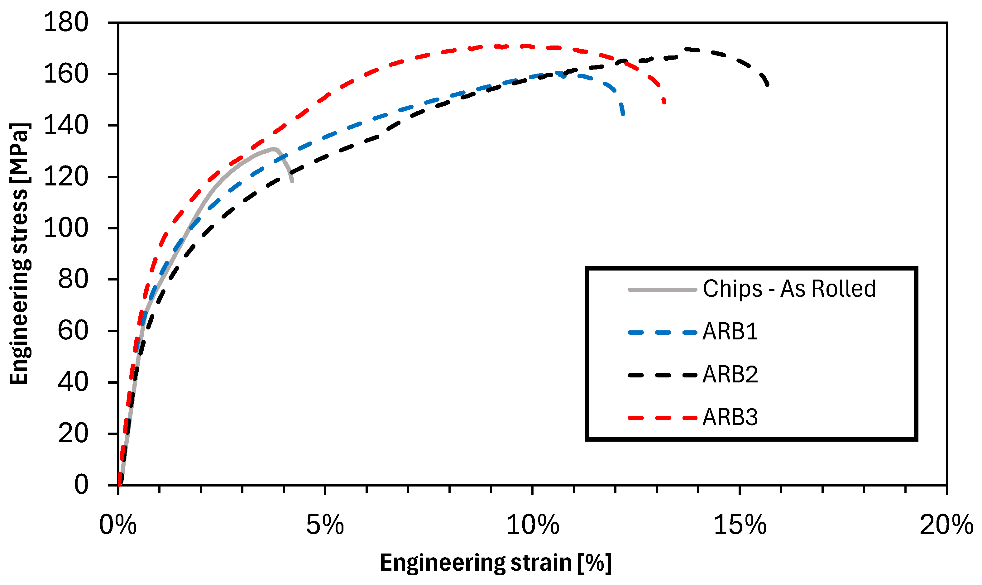 - The ARB process significantly improved chip consolidation; after two cycles, the material reached a UTS of 170 MPa and an elongation at break of 15.7%;