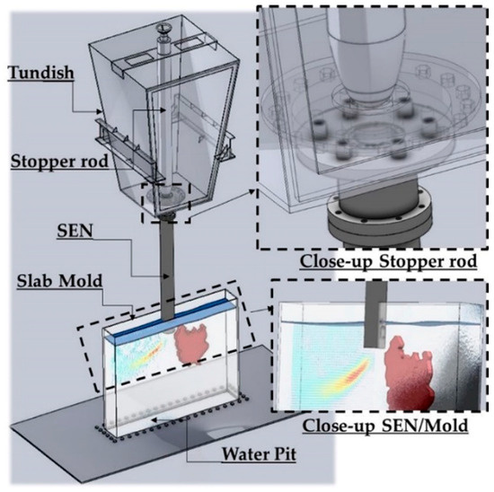 A full-scale physical model of the slab mold and corresponding SEN design was constructed to replicate the hydrodynamic conditions of the continuous casting process [36,37,38,39]. The model was assembled using translucent plastic panels (15 mm thick), with overall dimensions of 1.450 m × 0.235 m × 1.7 m. To model the behavior of liquid steel flow within the mold, the setup was partially submerged (0.7 m) in a water-filled reservoir designed to mimic the continuity of the slab strand. The reservoir was equipped with a 10 HP submersible pump that recirculated water through a vertical pipeline incorporating a flow meter and precision control valve. This configuration enables regulation of flow through one-third of a full-scale tundish replica, which included a stopper rod to control the casting speed. The SEN was centrally positioned at an immersion depth of 0.12m, measured from the top of the discharge port to the mold’s free surface. To model ferrostatic pressure effects observed in industrial casting, the tundish was filled to a height of 1m and held constant throughout experimentation. Casting speed was finely tuned using the integrated flow meter, control valve, and stopper rod, thus ensuring a consistent mold level and uninterrupted flow into the cavity. Experimental conditions were stabilized for 15 min prior to initiating data collection, which encompassed video recording and quantitative measurements. A schematic of the experimental setup is presented in Figure 2.