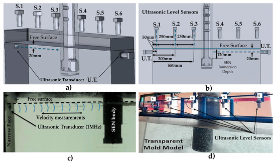 To assess flow velocities within the sub-meniscus region (defined as 20 mm below the free surface), a high-frequency ultrasonic transducer operating at 1 MHz was deployed. The sensor was mounted at the center of the narrow face of the plastic mold, precisely 20 mm beneath the mold surface to ensure accurate spatial targeting. The transducer emits an ultrasonic beam that interacts with the outer wall of the SEN, generating echo signals whose frequency shifts are recorded over time. These Doppler shifts are then processed to produce instantaneous velocity profiles along the beam axis, revealing dynamic flow behavior in the vicinity of the SEN. The specific location and orientation of the transducer within the experimental setup are depicted in Figure 3a,c. The free surface level within the mold cavity was continuously monitored for the entire duration of the experiment (300 s) using six ultrasonic sensors strategically distributed around the SEN. Three sensors were placed on the left side of the SEN and three on the right, at equidistant points to ensure symmetrical coverage of surface fluctuations. The specific positions were as follows: Sensor 1 was located 50 mm from the narrow face, Sensor 2 at 300 mm, and Sensor 3 at 550 mm. Sensors 4, 5, and 6 were installed at identical distances on the opposite side, providing a mirrored sensor layout. Figure 3b,d illustrate this arrangement.