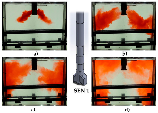 To reveal the flow pattern inside the mold, a red tracer (aqueous solution) is pulse-injected through a perforation in the outer wall of the SEN [40]. The mixing kinetics of the tracer within the plastic mold is recorded on video. Figure 4 displays the first seconds captured of the flow behavior corresponding to the SEN 1 design.