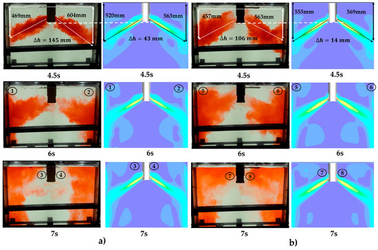 To begin the comparison between designs and simultaneously validate the numerical simulations, cases 3 and 6, shown in Table 1, were selected. Case 3 corresponds to the SEN-1 design operating at a casting speed of 1.4 m/min, while Case 6 represents the SEN-2 design under the same casting speed. These cases were selected as they represent extreme operating conditions, with the aim of highlighting more contrasting differences and evaluating the agreement between the experimental approach and the numerical simulations. Figure 6 illustrates three key moments during the tracer injection in the physical experiment: (1) when the jets reach the narrow face of the mold (4.5 s); (2) when the upper recirculating flows reach the free surface (6 s); and (3) when these upper recirculation’s reach the SEN wall (7 s), fully forming the double-roll flow (DRF) pattern.