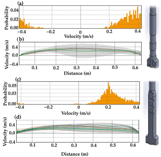 The flow velocity in the sub-meniscus region (20 mm below the free surface) is of critical importance, as this zone involves interaction between the molten steel and the mold flux layer [47,48]. This flux layer consists of three distinct phases: (1) molten flux in liquid state, which is in direct contact with the steel and acts as a lubricant between the copper mold and the solidifying steel strand; (2) flux in pasty state; and (3) solid flux. For this reason, it is essential to avoid excessively high velocities in this region (above 0.5 m/s) [49], as they can lead to the entrainment of molten flux particles into the molten steel [50]. Additionally, the flow pattern (particularly unidirectional velocities) should be controlled to prevent the vortex formation [51,52,53] that may draw liquid flux particles into the steel bath. Figure 7a,c show the probability density function (PDF) of the velocities measured by the ultrasonic transducer during the water model experiments. The PDF corresponding to SEN-1 (Figure 7a) indicates the presence of a bidirectional flow, from the narrow face toward the SEN wall and in the reverse direction, with notable velocity magnitudes exceeding 0.4 m/s in both directions. In contrast, the PDF for SEN-2 (Figure 7c) illustrates a unidirectional flow from the narrow face of the mold toward the SEN wall, with significantly lower velocities around 0.2 m/s.