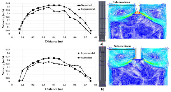 Figure 7b,d, corresponding to SEN-1 and SEN-2, respectively, present velocity profiles obtained from numerical simulations at different time steps (colored lines), while the gray shading zone represents the experimental velocity measurements over time captured by the ultrasonic transducer. As previously noted, SEN-1 exhibits greater temporal velocity variance, particularly at the midpoint between the mold’s narrow face and the SEN wall. Conversely, SEN-2 demonstrates a more stable velocity distribution. These findings suggest that the SEN-1 design has a higher probability of inducing mold flux entrapment, both due to shear layer instability and vortex formation [49,54]. To provide a clear comparison of the performance of each SEN design, Figure 8 presents the average velocity profiles at the sub-meniscus level, obtained from both the experimental and numerical approaches. Additionally, velocity vectors corresponding to 300 s of simulation (representing the steady state condition) are included to visualize the internal flow symmetry within the mold.