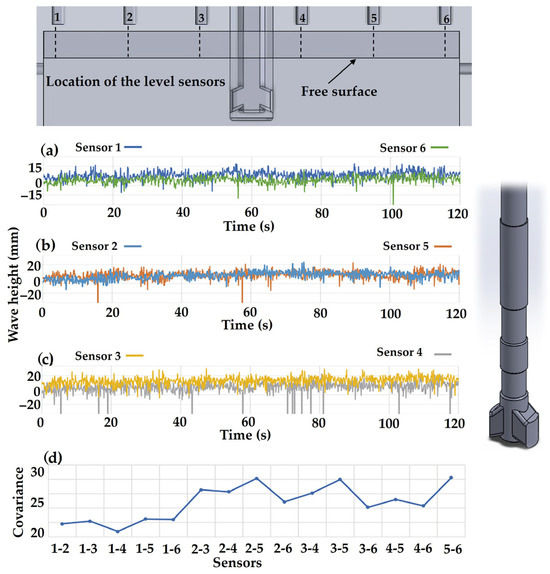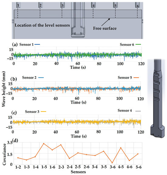 Free surface behavior using the SEN-1 design: (a) variations recorded by sensors 1 and 6, (b) sensors 2 and 5, (c) sensors 3 and 4, and (d) covariance of the free surface fluctuations.