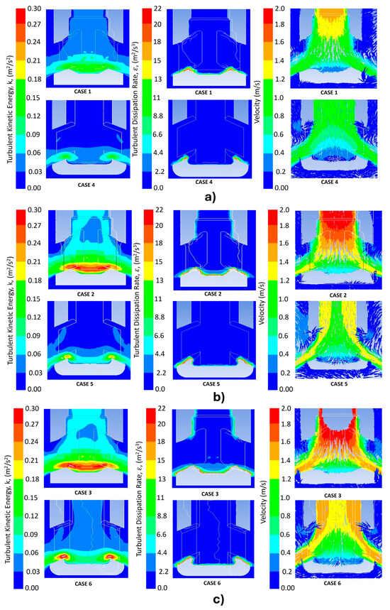 Contours of turbulent kinetic energy (k), turbulent kinetic energy dissipation (e), and velocity vectors at the discharge ports for both SEN designs: (a) comparison between designs at casting speed of 0.9 m/min (Case 1 vs. Case 4), (b) comparison at a casting speed of 1.2 m/min (Case 2 vs. Case 5), and (c) comparison at a casting speed of 1.4 m/min (Case 3 vs. Case 6).