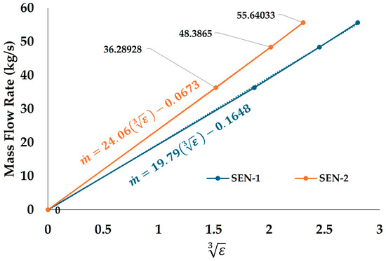 Values of mass flow rate, , turbulent kinetic energy, k, and turbulent kinetic energy dissipation, ε, extracted from Figure 11 and used for the calculation of .