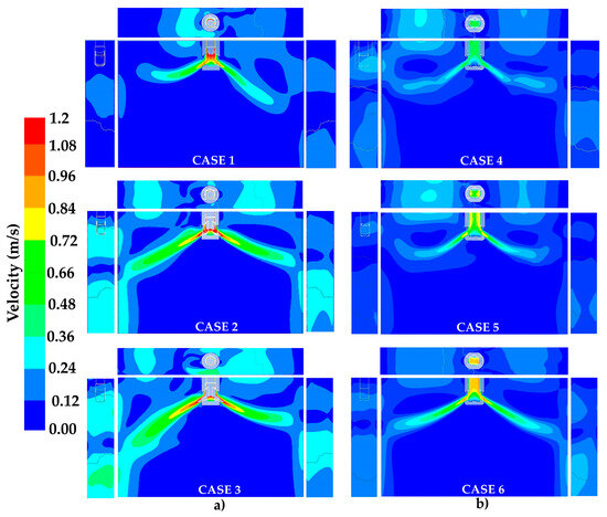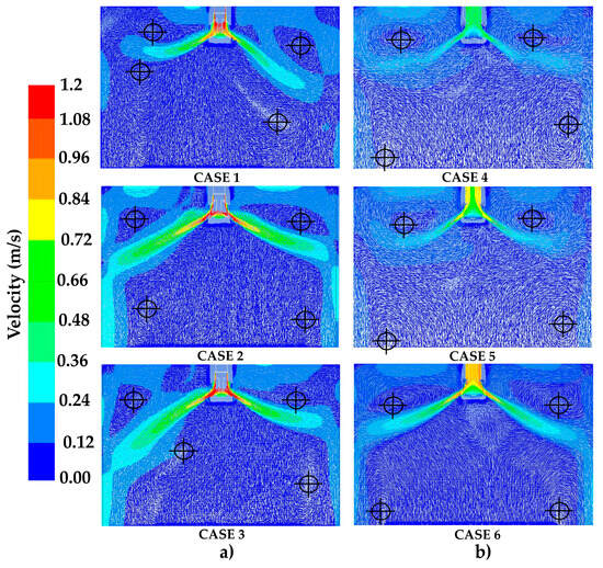 The velocity contours shown in Figure 13 reveal significant differences in the performance of the designs analyzed. These images correspond to the 300-s mark of the simulation, at which point the system is considered to have reached a steady state. At this stage, the velocities along the narrow walls and the free surface exhibit stable magnitudes. For the SEN-1 design, velocities in these regions exceed 0.3 m/s, except in Case 1, where the casting speed is the lowest (0.9 m/min). In contrast, the SEN-2 design maintains velocities below 0.3 m/s in the same areas. Furthermore, analysis of the discharge jets indicates that the SEN-2 design promotes a more symmetric flow pattern compared to SEN-1, regardless of the casting speed applied. To further clarify the flow symmetry, velocity vectors were captured in the central plane of the mold in Figure 14, allowing for the identification of the recirculation centers associated with the desired DRF pattern.