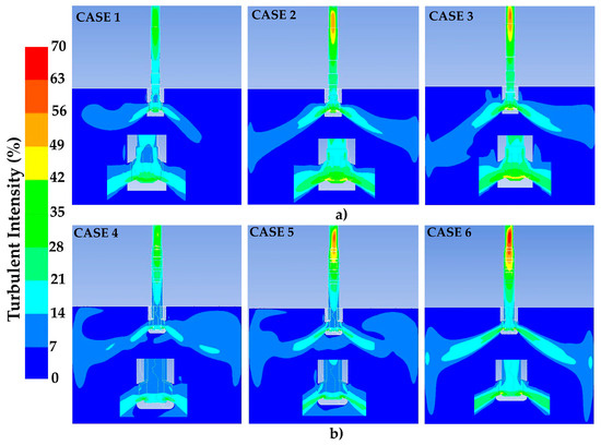 Although both SEN designs successfully generate the desired double-roll flow (DRF) pattern, only the SEN-2 design maintains a noticeable symmetry between the recirculation centers. The asymmetry observed in the SEN-1 design could be a contributing factor to quality issues, as flow symmetry and moderate velocities in critical regions (such as the narrow walls and the free surface) are essential for efficient heat transfer from the strand to the mold. Finally, to further analyze the flow behavior within the mold, turbulence intensity contours were calculated and compared across the six simulated cases, as shown in Figure 15.