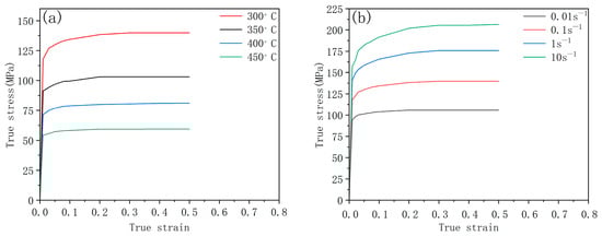 True Stress–Strain Curves of 7075-T6 Aluminum Alloy (a) under a range of temperatures from 300 °C to 450 °C at a strain rate of 0.1/s (b) under a range of strain rates at a constant temperature of 300 °C.
