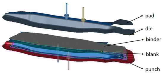 The hot stamping process simulation of the crash beam was performed using AutoForm software (version R8). The blank mesh was shell element, with a maximum element size of 20 mm and a minimum size of 5 mm. The hot stamping tools for the crash beam includes the punch, die, binder, and pad. Because the deformation of the tools during the hot stamping process is negligible compared to that of the blank, the tools were set as rigid bodies []. The initial tools setup is shown in Figure 3.