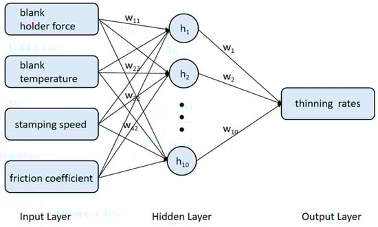 The structure of the BP neural network is shown in Figure 4, consisting of three main layers: input layer, hidden layer, and output layer. The input layer contains four nodes corresponding to the process parameters-blank holder force, heating temperature, stamping speed, and friction coefficient. The output layer has a single node representing the predicted thinning rate. To enhance the model’s representation capability, the hidden layer is set with 10 neurons.