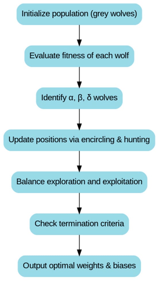The Grey Wolf Optimizer (GWO) is a bio-inspired metaheuristic algorithm modeled on the social hierarchy and hunting behavior of grey wolves. It is widely used to optimize the initial weights and biases of BP neural networks, enhancing training performance and generalization ability []. The grey wolf population is divided into four roles: α, β, δ, and ω. The α wolf represents the current best solution and leads the search process. The β wolf, representing the second-best solution, supports the α wolf in guiding the search when the global optimum is not yet found. The δ wolf holds a good solution and assists in optimization, while the ω wolves, representing inferior solutions, act as followers during hunting. Their role is to explore the broader solution space and provide diverse potential solutions for the population.