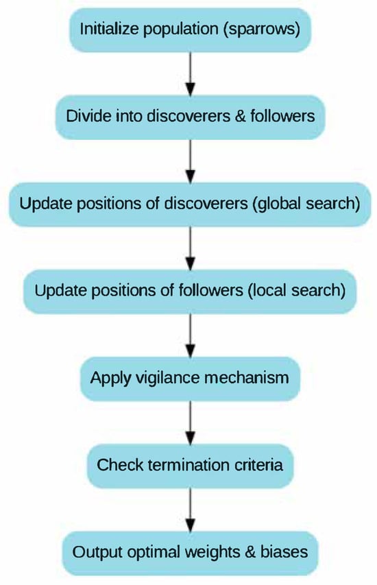 The Sparrow Search Algorithm (SSA) is a swarm intelligence optimization method inspired by the foraging and vigilance behaviors of sparrows []. The algorithm simulates the role of leaders and followers within a sparrow population to dynamically balance global exploration and local exploitation in the search for optimal solutions. The population consists of foragers and sentinels-where foragers explore optimal solutions, and sentinels help prevent the swarm from getting trapped in local optima.
