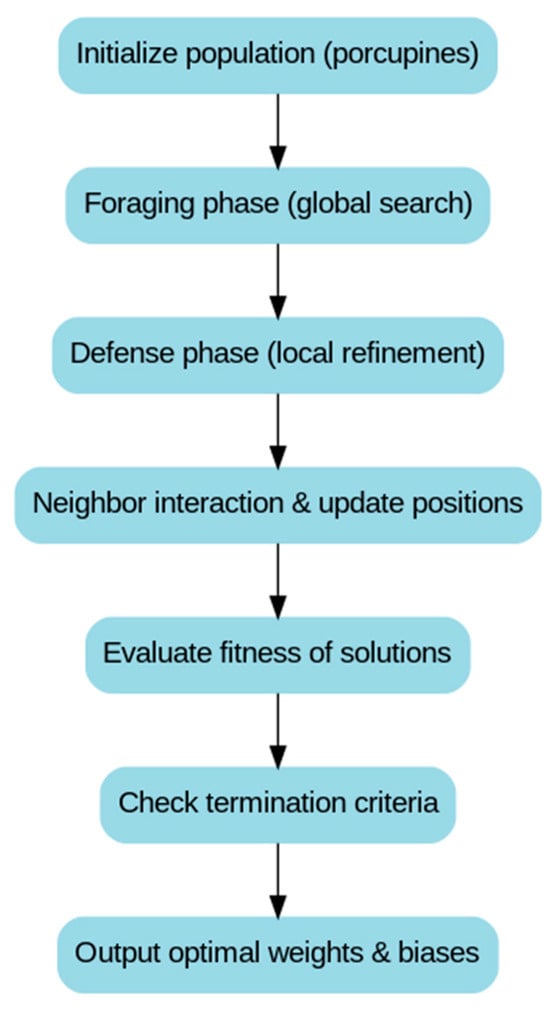 The Crested Porcupine Optimization (CPO) algorithm is a bio-inspired intelligent optimization method that simulates the foraging and territorial defense behaviors of crested porcupines in nature []. When searching for food, crested porcupines adopt both cooperative and competitive strategies, while in the face of external threats, they defend themselves using their sharp quills. CPO leverages this dual behavior to balance global exploration and local exploitation, effectively avoiding local optima and accelerating convergence when optimizing the weights and biases of BP neural networks.