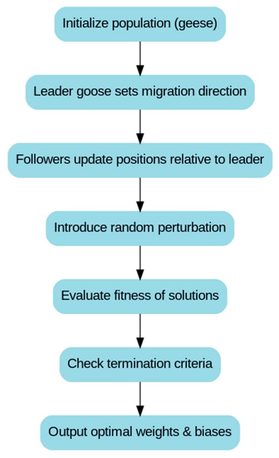 The Goose Optimization Algorithm (GOOSE) is inspired by the coordinated flight behavior of geese during migration []. In a migrating flock, the lead goose sets the direction, while the others adjust their relative positions to optimize the flight path. This cooperative mechanism forms the basis of GOOSE, enabling strong global search capabilities and improved solution quality during local exploitation when optimizing the weights of BP neural networks.