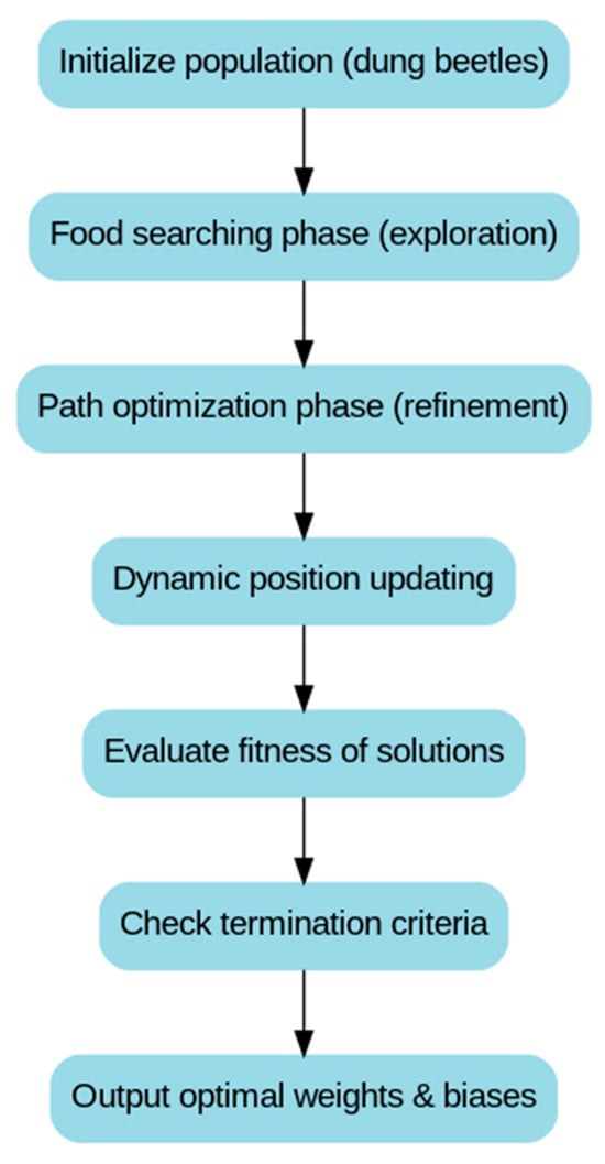 The Dung Beetle Optimization (DBO) algorithm is inspired by the dung beetle’s behavior of rolling dung balls, simulating its continuous path adjustments while foraging and transporting food to adapt to environmental changes []. By introducing an environmental adaptation mechanism, DBO improves the training efficiency and prediction performance of BP neural networks.