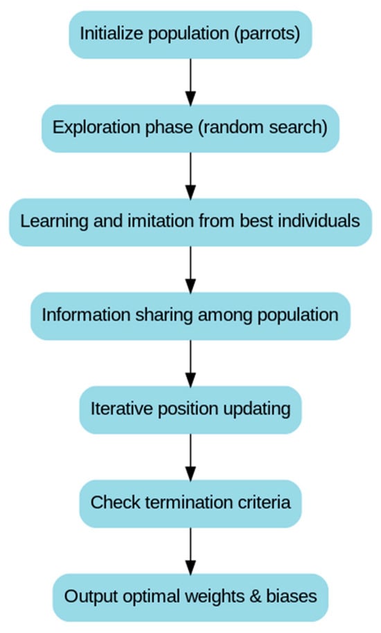 The Parrot Optimization (PO) algorithm is a global optimization method based on swarm intelligence, inspired by the learning and imitation behaviors of parrots []. The algorithm achieves optimal solution search through information exchange, imitation, and experience accumulation among the parrot population. Its optimization process includes exploration, learning, imitation, and adjustment, and is suitable for optimizing the weights and biases of BP neural networks to overcome the local optimum convergence problem in traditional BP networks, thereby improving training accuracy and convergence speed.